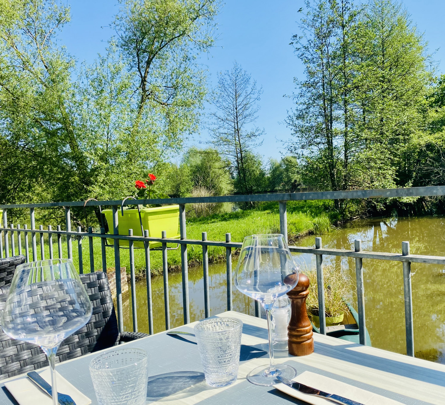 Het terras biedt een idyllisch uitzicht op het water en vormt de ideale plek om te genieten van de Hagelandse natuur.